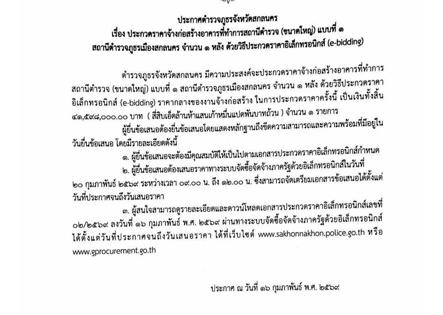ประกวดราคาจ้างก่อสร้างอาคารที่ทำการสถานีตำรวจ (ขนาดใหญ่)แบบที่ 1 สภ.เมืองสกลนครจำนวน 1 หลัง ด้วยวิธีประกวดราคาแบบ (e-bidding) 19 กุมภาพันธ์ 2026 โดย admin / ข่าวจัดซื้อจัดจ้าง ดาวน์โหลดเอกสาร