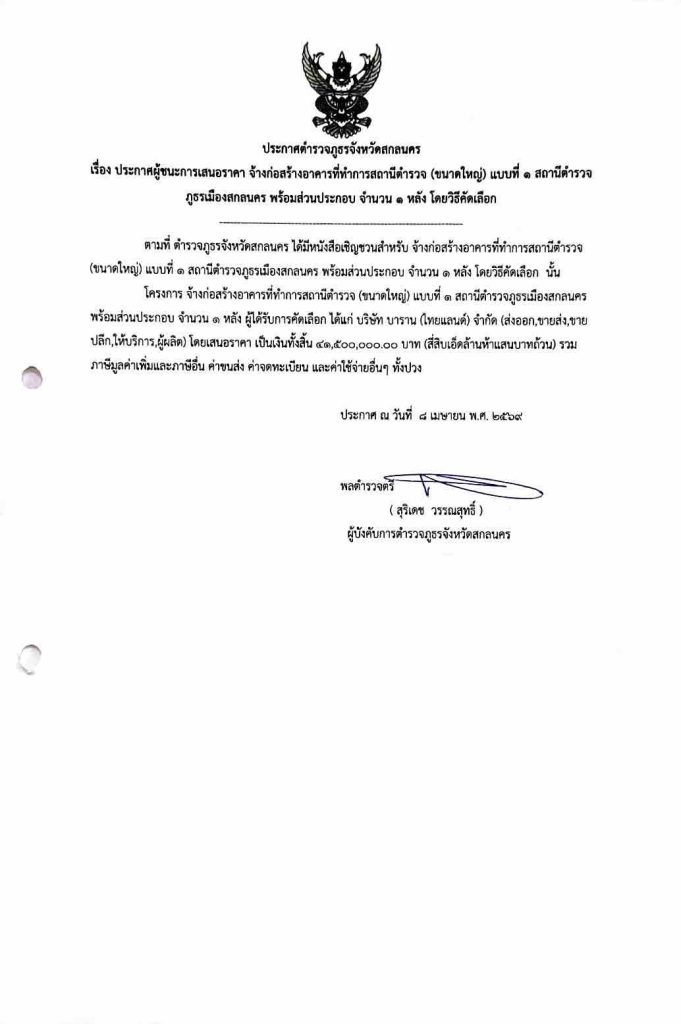ประกาศผู้ชนะการเสนอราคา จ้างก่อสร้างอาคารที่ทำการสถานีตำรวจ(ขนาดใหญ่) แบบที่ 1สถานีตรวจภูธรเมืองสกลนคร พร้อมส่วนประกอบจำนวน 1 หลัง โดยวิธีคัดเลือก 21 เมษายน 2026 โดย admin / ข่าวจัดซื้อจัดจ้าง