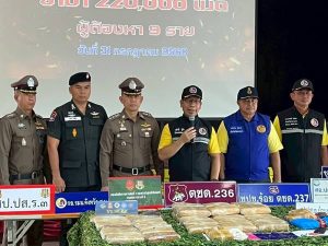 ร่วมแถลงข่าวผลการจับกุมผู้ต้องหา 9 คน พร้อมของกลางยาบ้า 220,000 เม็ด รถยนต์ 4 คัน รถจักรยานยนต์ 6 คัน และอาวุธปืนไทยประดิษฐ์ 4 กระบอก ตามนโยบายป้องกันสกัดกั้นและปราบปรามยาเสพติดในพื้นที่ชายแดนseal stop safe ของรัฐบาลและนโยบายปฏิบัติการกวาดล้างยาเสพติด no drugs no dealer