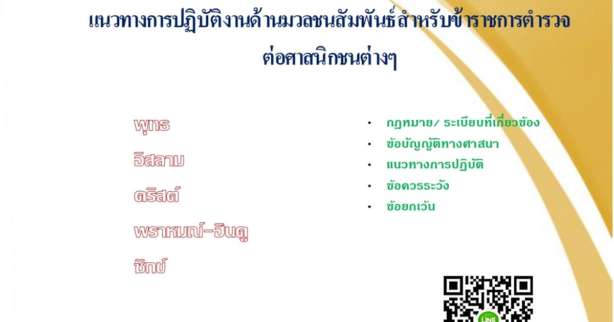 แนวทางการปฏิบัติงานด้านมวลชนสัมพันธ์สำหรับข้าราชการตำรวจต่อศาสนิกชนต่างๆ 10 ตุลาคม 2024 โดย admin / ข่าวประชาสัมพันธ์,ข่าวฝากประชาสัมพันธ์ คลิกที่ภาพเพี่อดาวน์โหลด