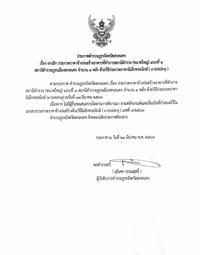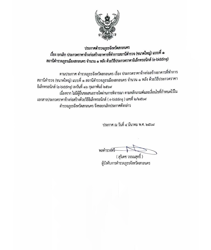 ยกเลิก ประกวดราคาจ้างก่อสร้างอาคารที่ทำการสถานีตำรวจ (ขนาดใหญ่)แบบที่ 1 สภ.เมืองสกลนครจำนวน 1 หลัง ด้วยวิธีประกวดราคาอิเล็กทรอนิกส์แบบ (e-bidding) 1 เมษายน 2026 โดย admin ดาวน์โหลดเอกสาร